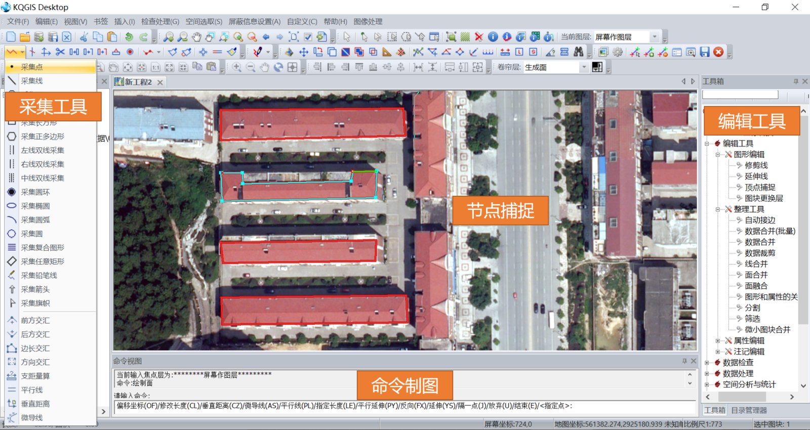 KQGIS Desktop獨創(chuàng )GIS與CAD相結合的采集模式,保留CAD命令輸入的采集方式,兼顧規劃專(zhuān)業(yè)用戶(hù)的操作習慣,提高數據采集的便捷性與采集效率,同時(shí)保證采集數據符合GIS數據的特性,擁有較強的擴展性和兼容性。