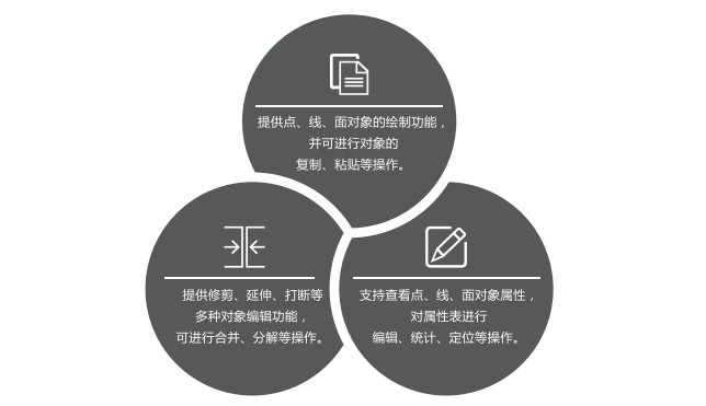 KQGIS Desktop采用內存與臨時(shí)文件結合模式,使用戶(hù)無(wú)需開(kāi)啟編輯模式便可即時(shí)進(jìn)行數據編輯,有效解決多用戶(hù)編輯版本沖突問(wèn)題,提高了編輯過(guò)程的流暢性與便捷性;同時(shí)提供豐富的對象編輯工具,支持多種對象繪制方式,有效提升對象編輯的效率。